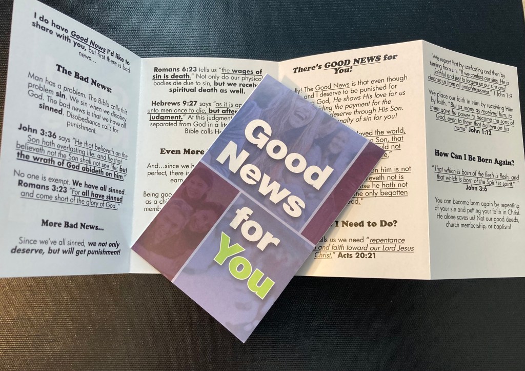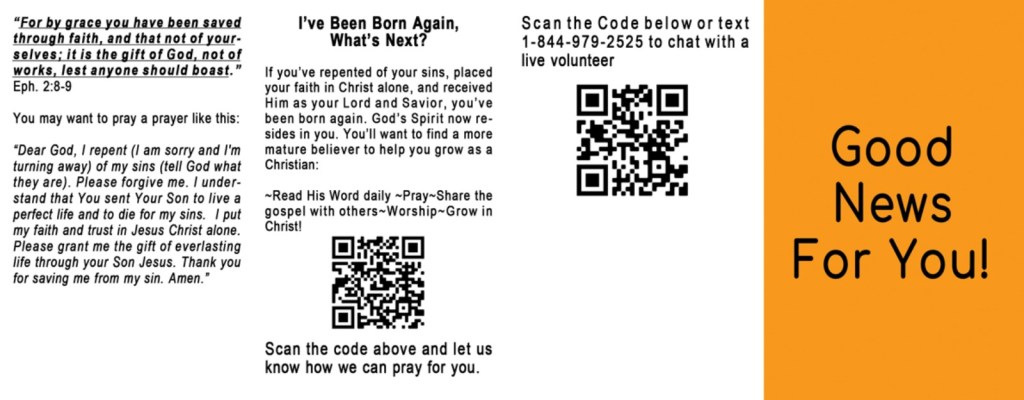 I’ve partnered with the Gospel to Every Home effort with the Kentucky Baptist Convention and produced a Good News tract in KJV that is a quad-fold and allows for a little more space for QR codes and a sample gospel prayer. I really like the quad-fold tract. It will be the one I base my future GNFY tracts on as I like the layout and room for QR codes.