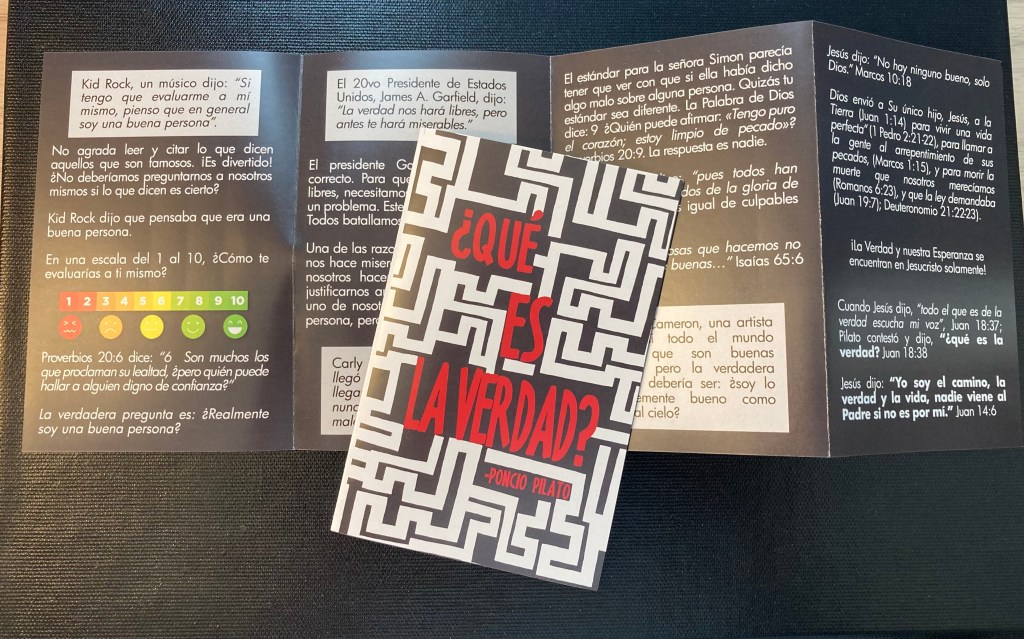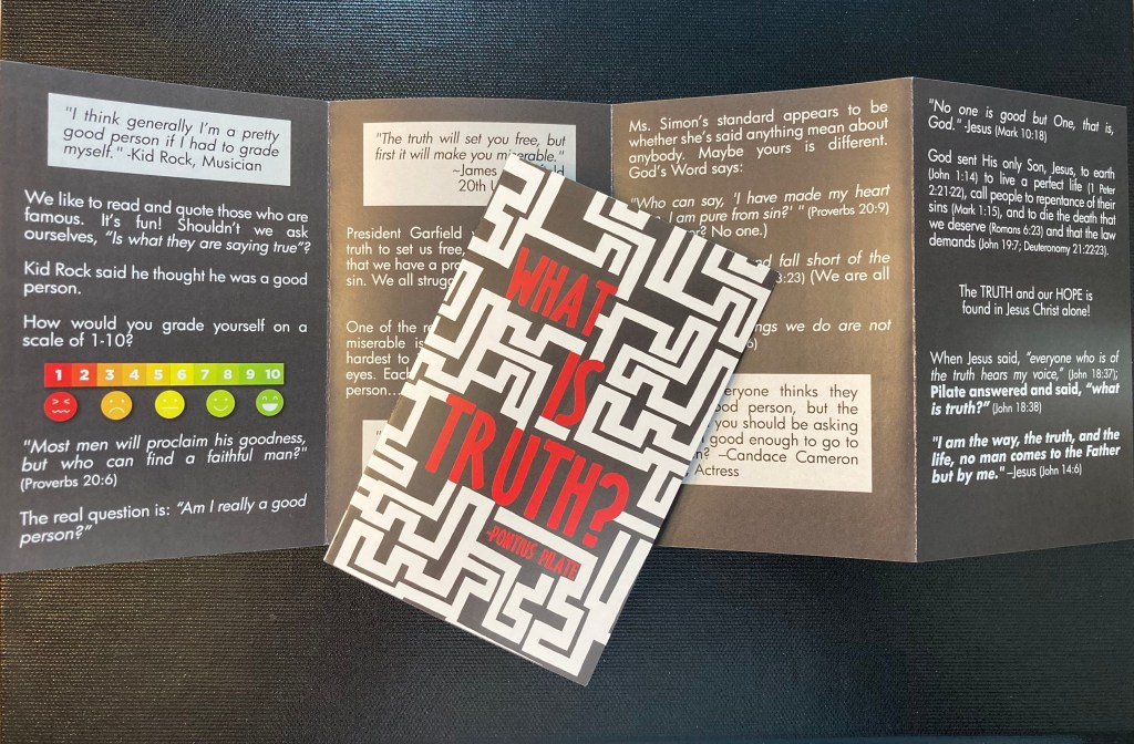 2020 was an interesting year to say the least! One morning I was reading the Bible, praying, and asking the Lord how I could serve Him evangelistically during that tough season. He gave me the idea to produce the “What is Truth?” tract in English and Spanish. I’m extremely grateful for Pastor Jamie Masso who has translated several tracts into Spanish for me. What is Truth? is based on Pontius Pilate’s question of Jesus in John 18:38. Throughout the tract I used quotes from famous people (actors, musicians, and politicians) and end with Pilate’s quote as I share the gospel. Here is a gospel presentation I like to share.