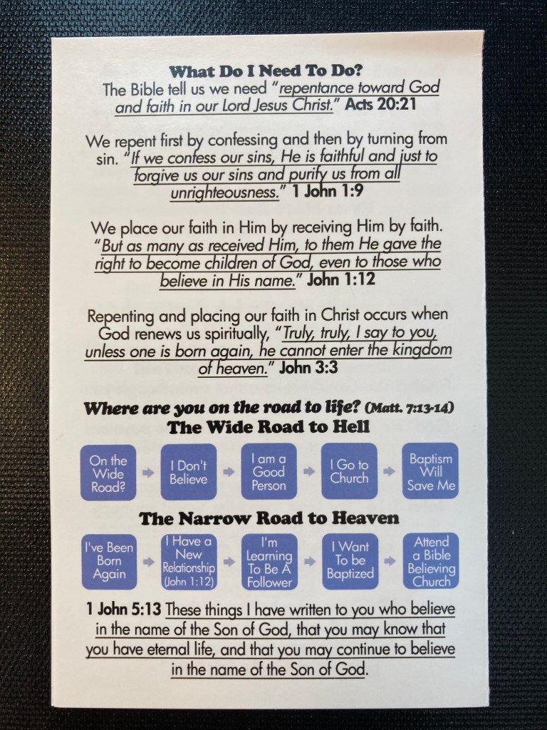 In 2022 I would like to produce a couple more GNFY tracts. My goal is to have a black and orange one (like the GTEH example in NKJV or ESV) for the fall season and a red and green one for Christmas. Each fall I get asked by friends if I know of a good tract for Halloween. I get mine at LivingWaters, but thought I mind provide some GNFY this year! The same is true for Christmas. Check out the picture of the tracts with little candy canes Concord Baptist did in 2016 and 2017 below! In 2023 my goals are to produce spring and summer themed tracts to have on hand.
