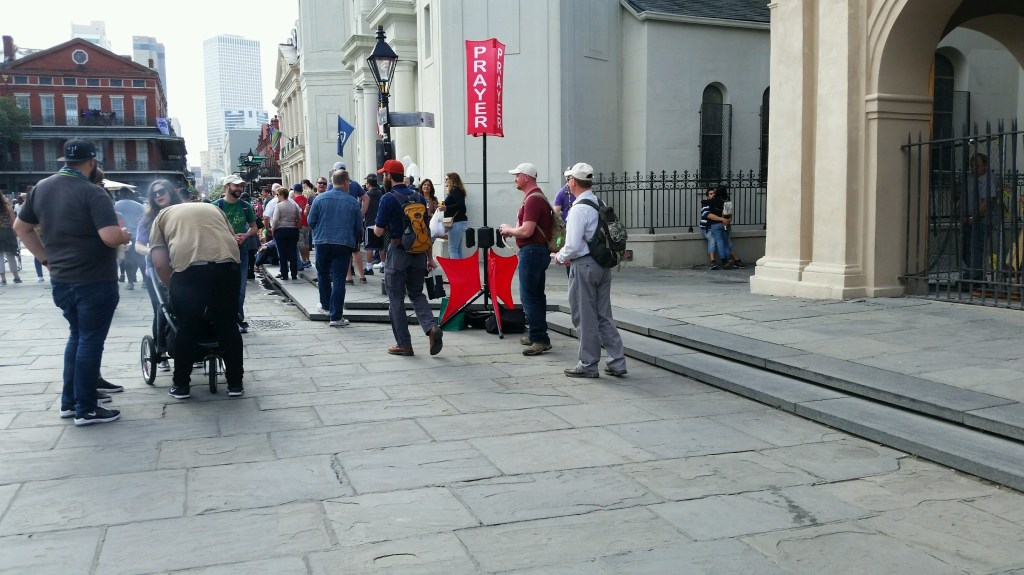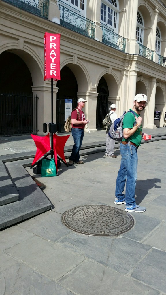 Several years ago I purchased a prayer stand for use at events. It’s highly visible, does a great job letting people know what you are doing, and helps you organize gospel material. Here are a couple videos that show an example of what you can do on your own with the prayer stand: Prayer Stand Conversation; Evangelistic Praying.