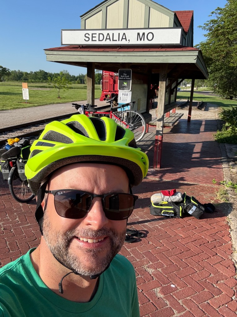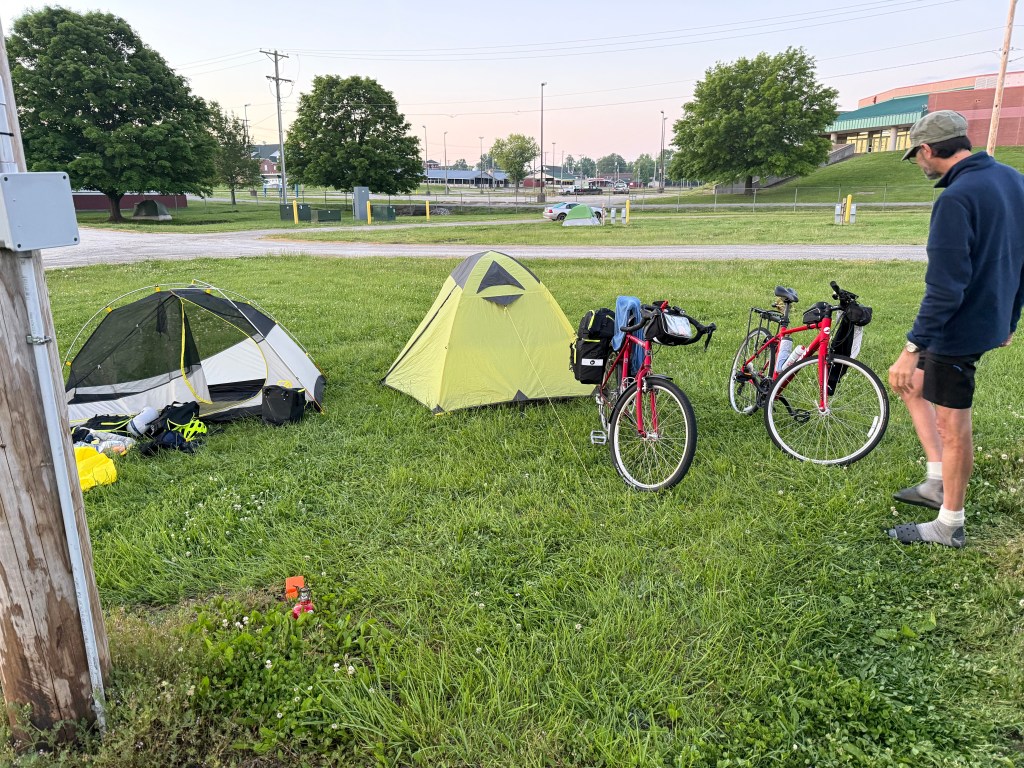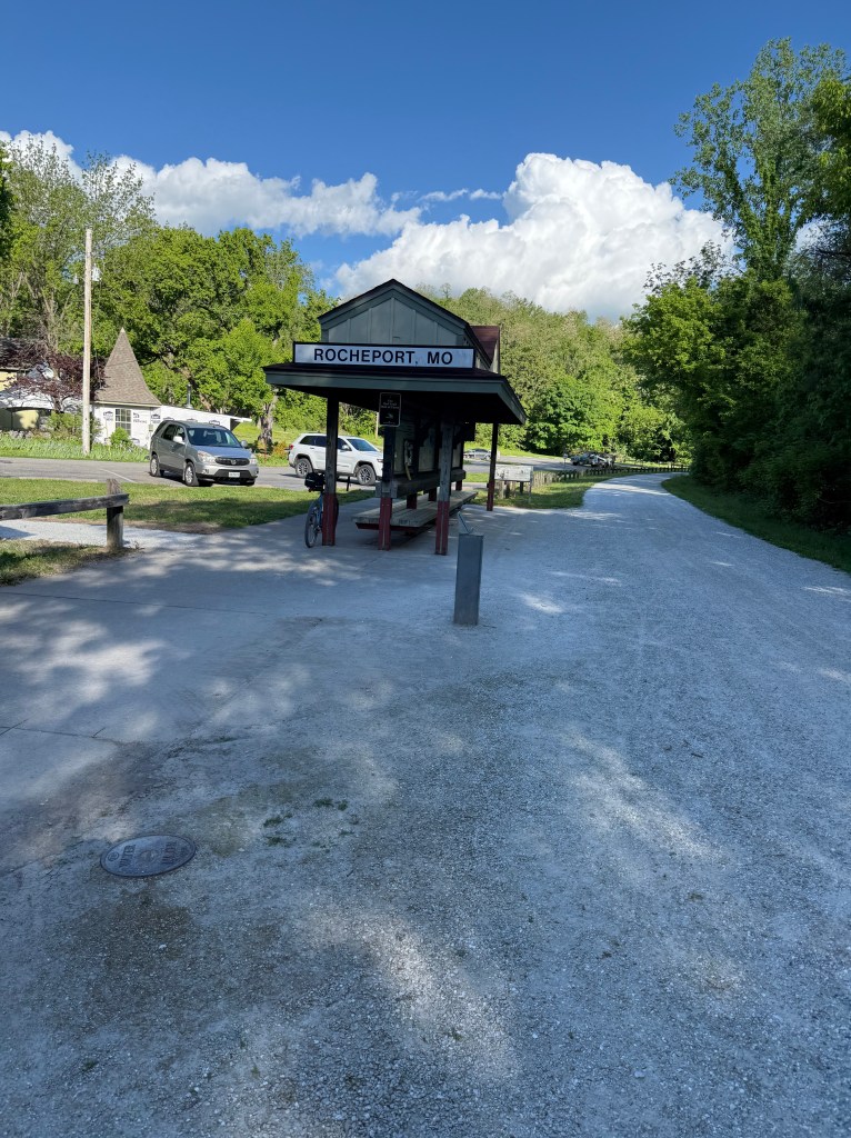We arrived in Rocheport at around 4 pm, and we were exhausted! There were no camping sites, so we decided to rest awhile and keep biking toward Easley and Cooper’s Landing Campsite. The remainder of the day’s ride was downhill (15 miles). Our biking friend, Ova, also arrived and was so tired that he slept at the train station in the picture above.