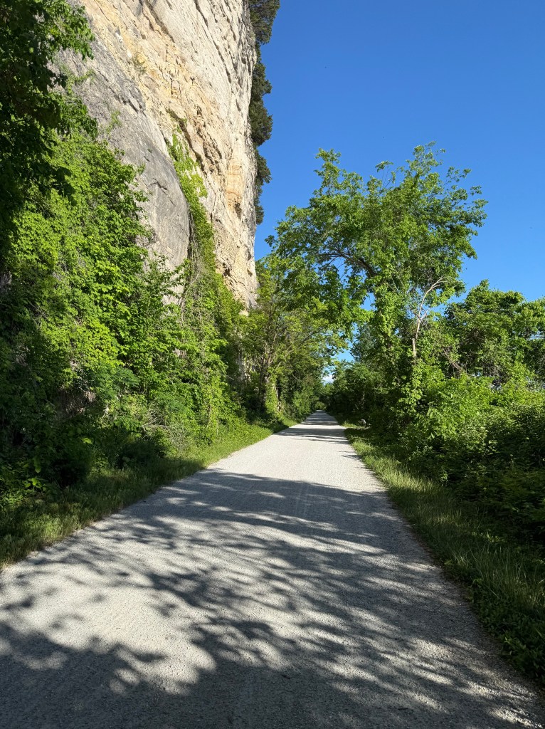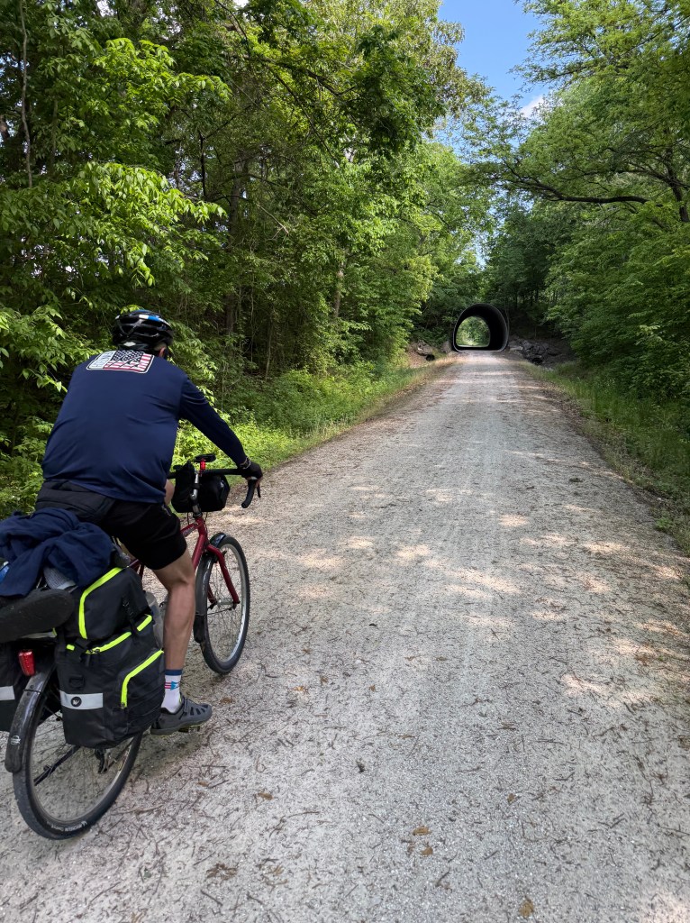 When we arrived at the trailhead, we heard someone whistling at us and noticed our new friends from the shuttle in Clinton. They had saved a banana for Eddie (he’d been talking the day before about looking for bananas and a cappuccino on the trip!). While we were talking, one of the guys told us we needed to check out the historical pieces inside the Boonville Trail Museum. While in there, we were able to find the tools we needed to fix my bike properly!!